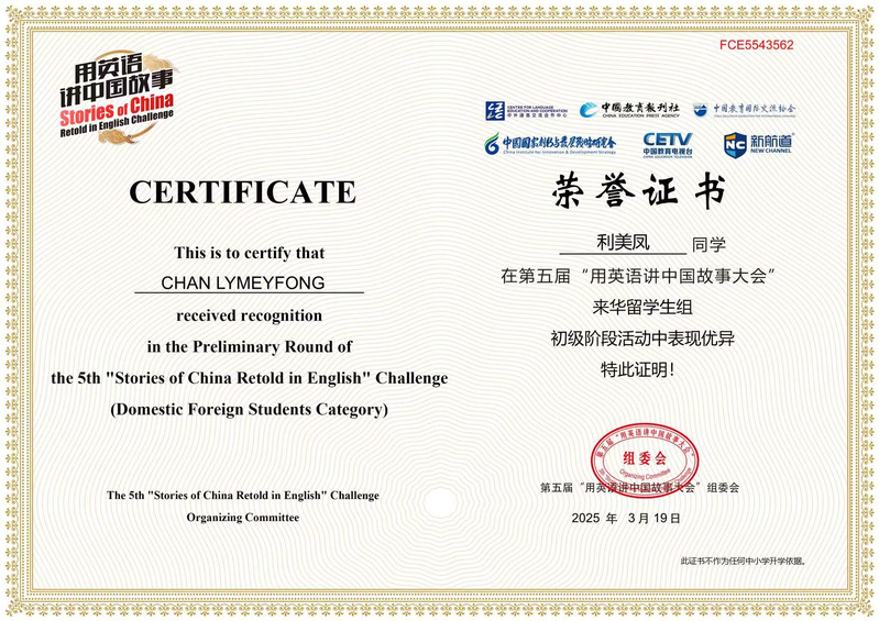 在国际交流学院积极动员与悉心指导下,我校留学生积极参与第五届“用英语讲中国故事大会”,经过激烈角逐与专家评议,来自柬埔寨的蔡清琳、蔡小妹、丽佳达、陈慈莉、利美凤5位同学和喀麦隆的方迪同学在初级阶段凭借出色发挥脱颖而出,取得优异成绩,成功入围高级阶段比赛,他们不仅展示了自身扎实的中文功底,更体现出对中国文化的深刻理解与热爱。目前,六名晋级学生正在积极备战高级阶段比赛。